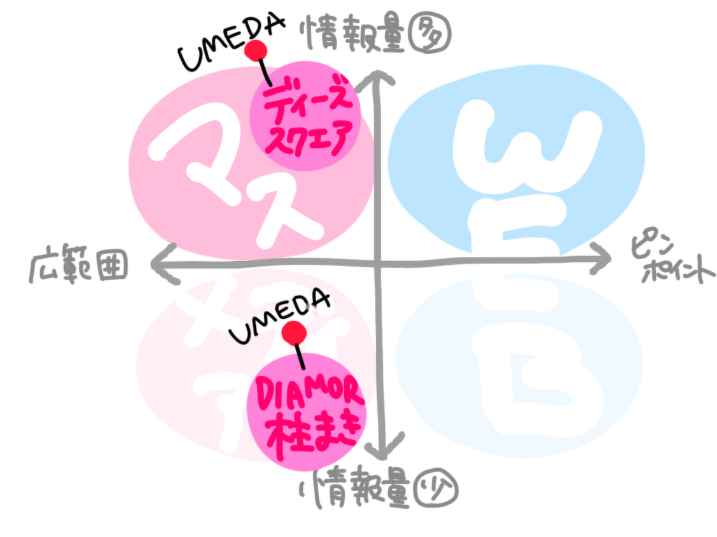 これを先の2軸で考えると、ウェブ広告のような高精度な属性ターゲティング(ヨコ軸の右端)とは異なりますが、「梅田を利用する層」「生活動線上にある層」といった**「場所・生活動線ターゲリング」**という独自のターゲティング軸を持ちます。情報量(タテ軸)については、柱巻き広告は静止画中心で「少」、ディーズスクエアでのイベントは体験や対話を通じて「多」となります。特にディーズスクエアは、設備の充実度や運営サポートを含めると、情報量だけでなく「体験価値」という点でも非常に優位性があると言えます。