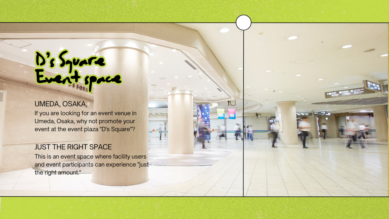 ディーズスクエアは、梅田1丁目に位置し、各線梅田駅を結ぶ公共地下歩道上の屋内イベントスペースです。