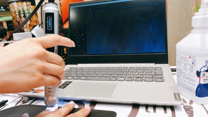 ①お客様とのタッチポイントとして、だれでも参加無料の「血管チェック」を実施。指先の血管を顕微鏡で測定し、お客様ひとりひとりの血管の状態を、PCの画面に映しながら、生活改善のアドバイスを行う。
