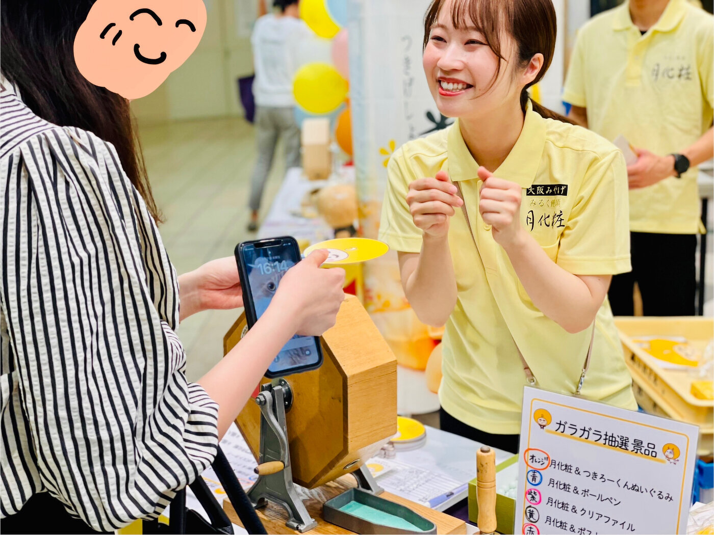 「月化粧の日」を祝うこのイベントは、平日のディアモール大阪にたくさんの笑顔を咲かせました。特に、公式SNSをフォローするだけで参加できるガラガラ抽選会は、景品の鐘の音が響き渡るたびに注目を集め、会場は大いに盛り上がりました。月化粧や伊右衛門月化粧、そして可愛い「つきろーくん」の限定グッズは、参加されたお客様にとって嬉しいサプライズとなりました。物販コーナーも予想を上回る賑わいで、用意していた月化粧はなんと完売!「これ知ってる!美味しいよね!」という声や、「初めてだけど美味しそう!」とSNSをフォローしてくださる方もいらっしゃいました。お客様との温かい交流が、イベントをさらに素敵なものにしました。