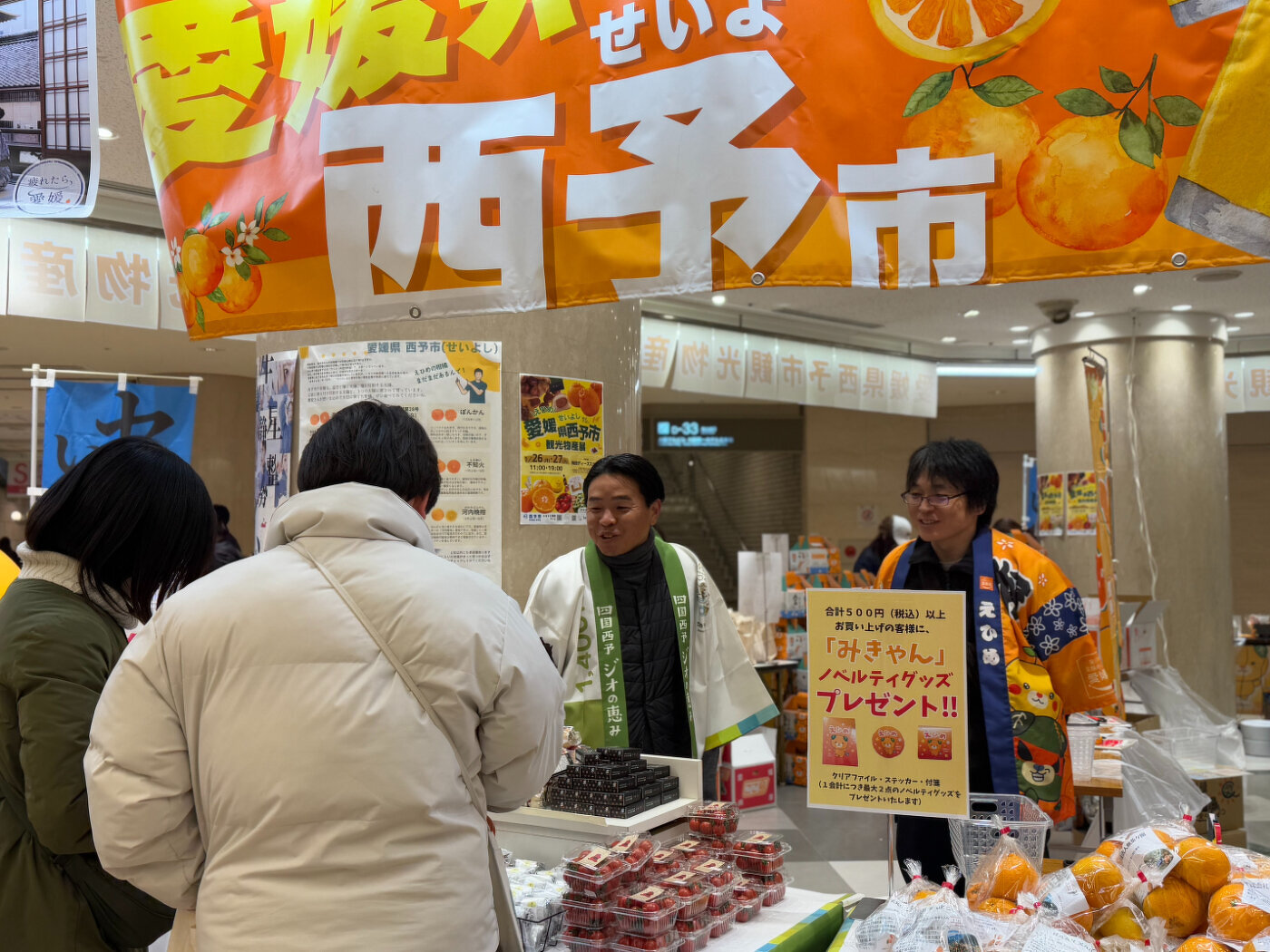 愛媛県西予市(せいよし)の豊かな自然が育んだ特産品と観光の魅力をたっぷりお届けする2日間!今回は西予市の産直市をメインに、地元で愛される「おいしいもの」を産地直送で販売いたします。会場では、愛媛県PRキャラクター「みきゃん」の着ぐるみが登場するほか、ノベルティ配布やバルーン設置など、楽しいコンテンツをご用意して皆さまをお待ちしております!