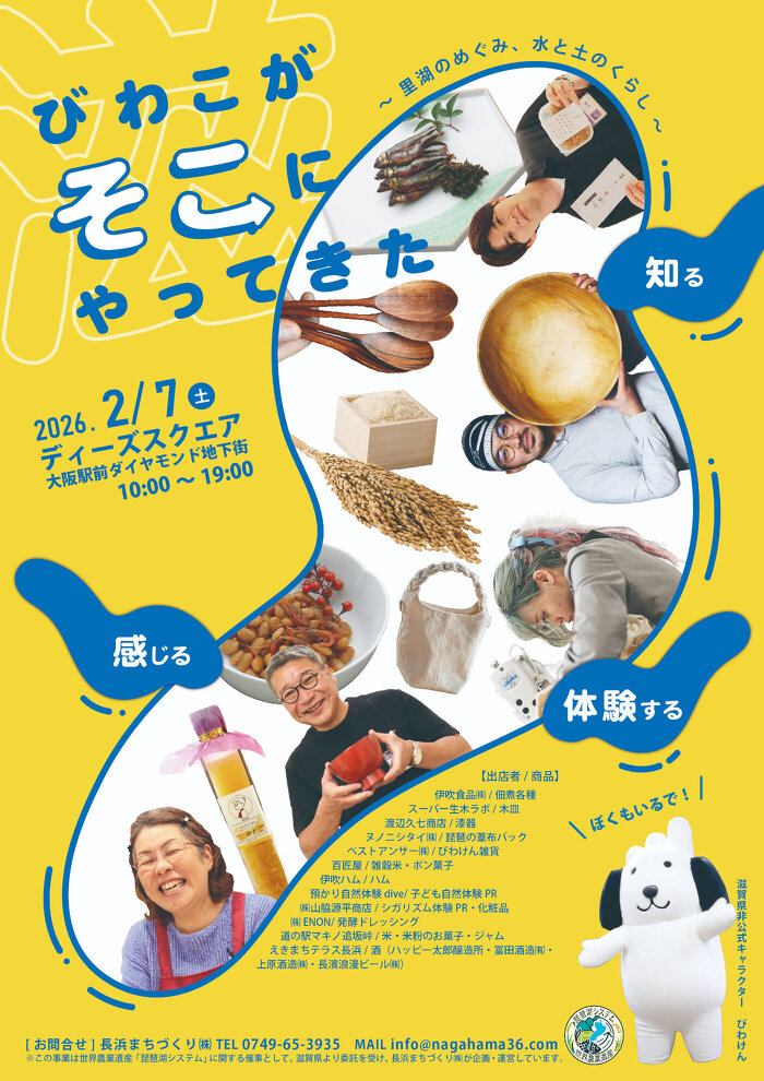 滋賀・北近江(長浜・米原・高島)の恵みが大阪駅前に大集合! 世界農業遺産にも認定された「琵琶湖システム」が育んだ、豊かな食と手仕事を体感しませんか?会場では、炊きたての近江米や、旨みたっぷりの湖魚の佃煮の試食もご用意しています。 滋賀の非公式キャラクター「びわけん」も一日中遊びに来てくれますよ!