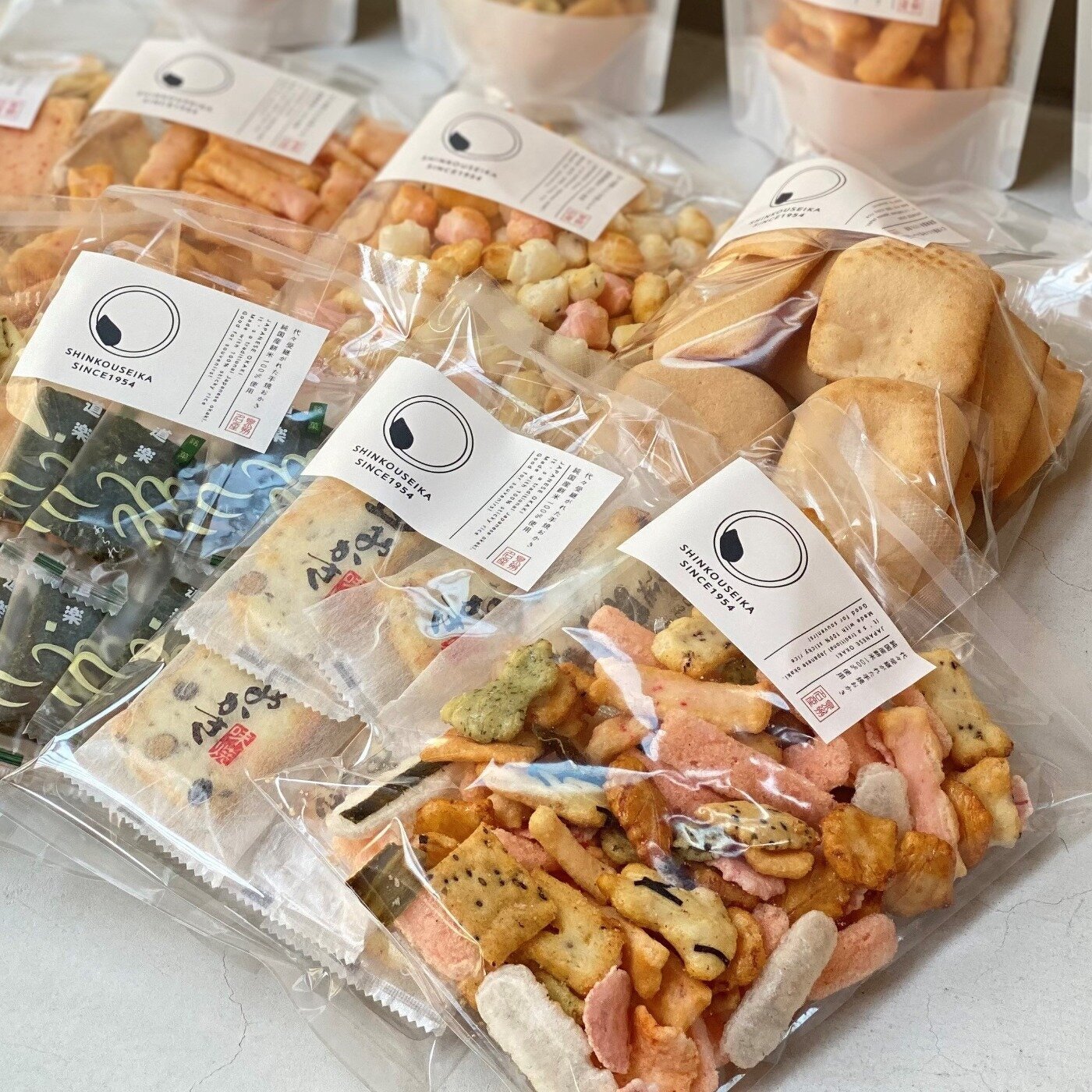田舎焼き、海老サラダ、小粒あられ、サト焼き、マヨネーズ、みりん醤油、のり巻き、豆おかき、ぶどう山椒、スタンドパックアソート