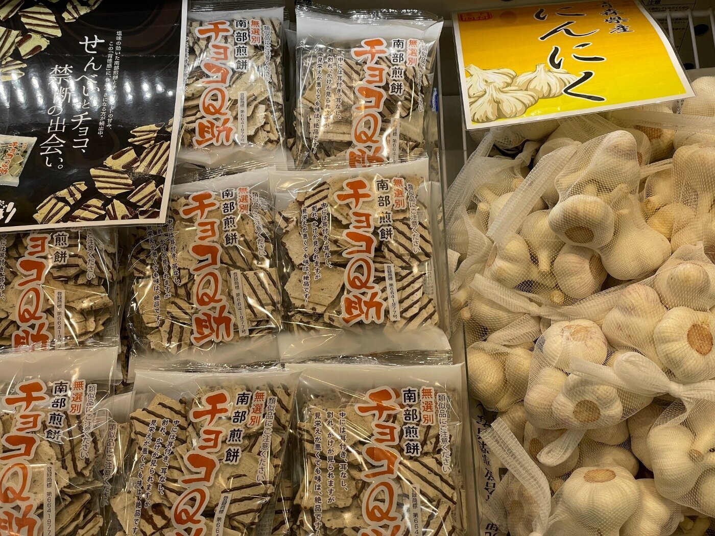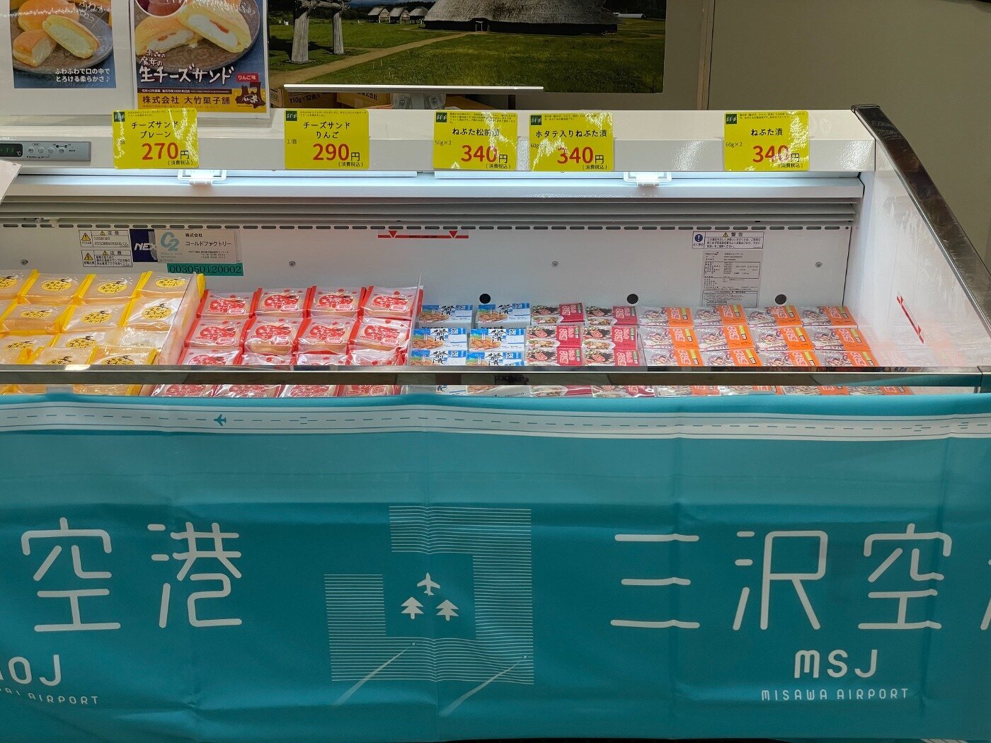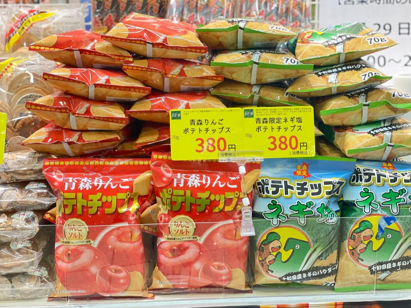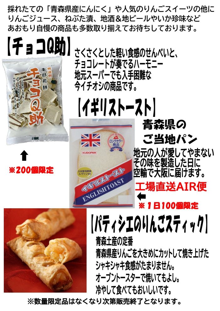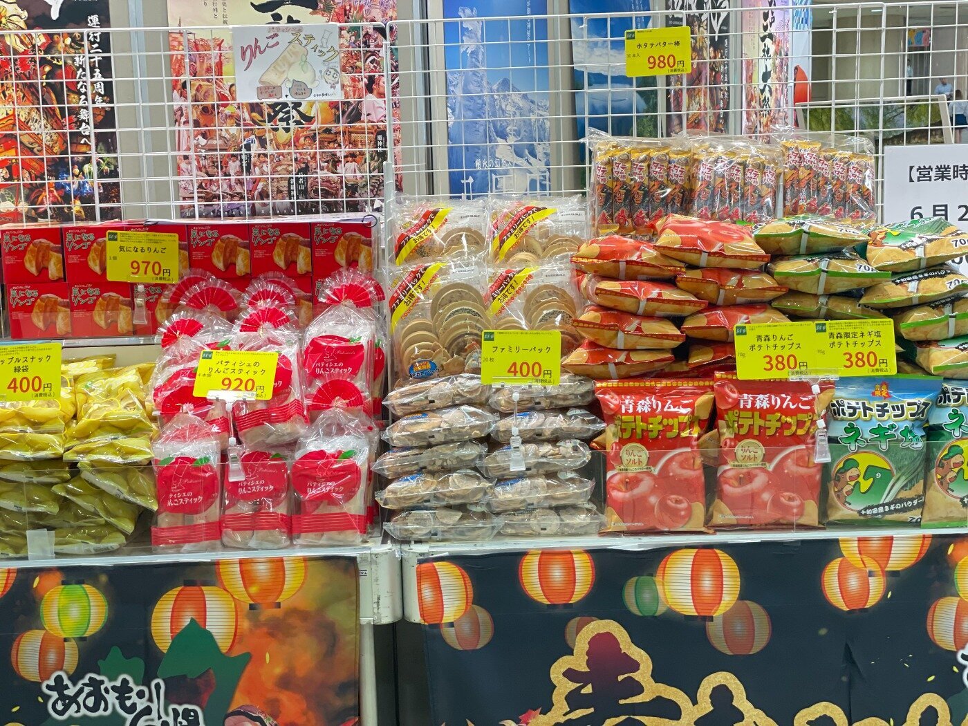 りんごジュース(希望の雫/金のねぶた/銀のねぶた/青森のおもてなし ふじ/青森のおもてなし 王林)、パティシェのりんごスティック、気になるりんご、アップルスナック(赤袋/ピンク袋/緑袋/オレンジ袋)、東北みやげせんべいファミリーパック、青森限定じゃがぼーの、ホタテバター棒、青森りんごポテトチップス、青森限定ネギ塩ポテトチップス、チョコQ助、チーズサンド(プレーン/りんご)
