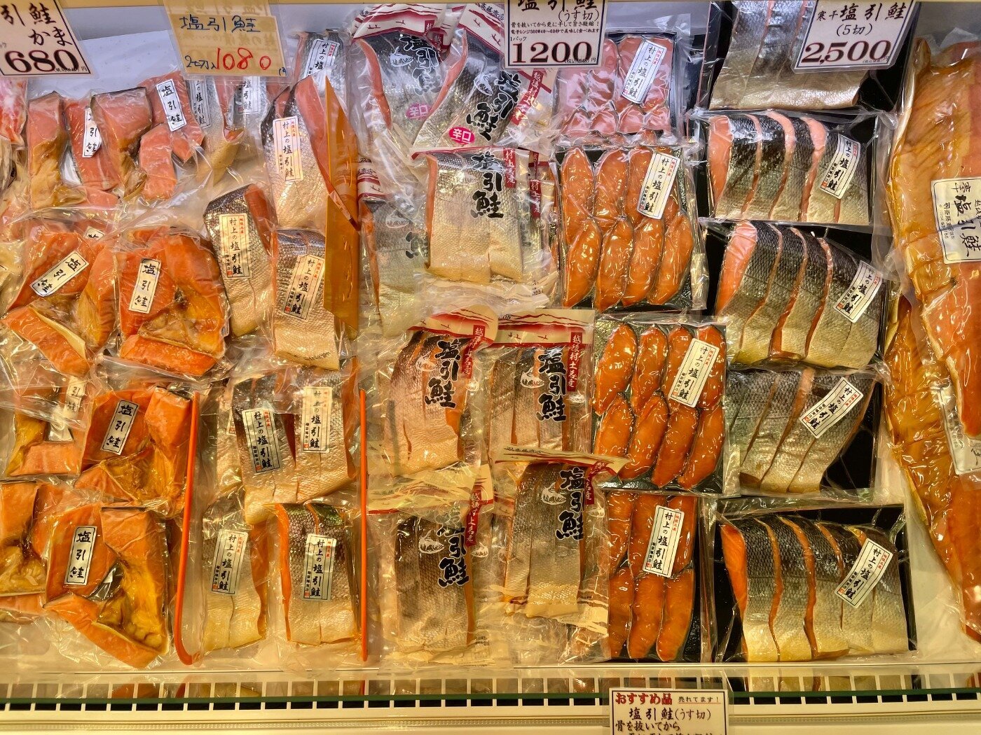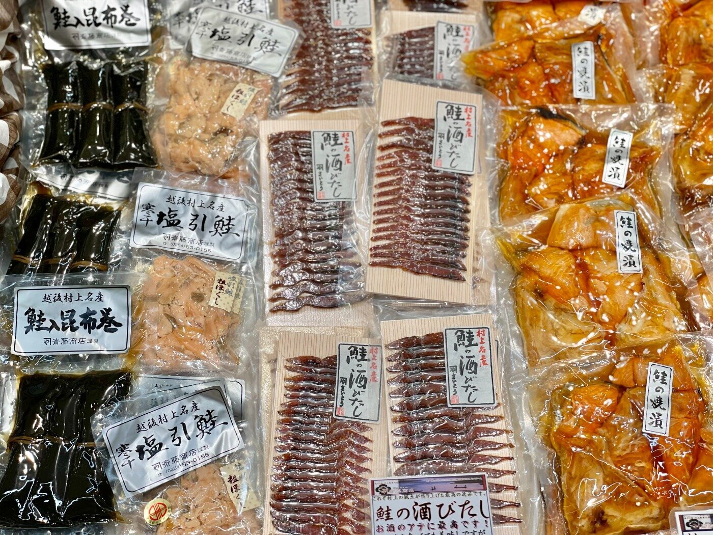 塩引き鮭、鮭の焼き漬、鮭の酒びたし、鮭入り昆布巻き、鮭とば、にしん甘露煮、棒だら
