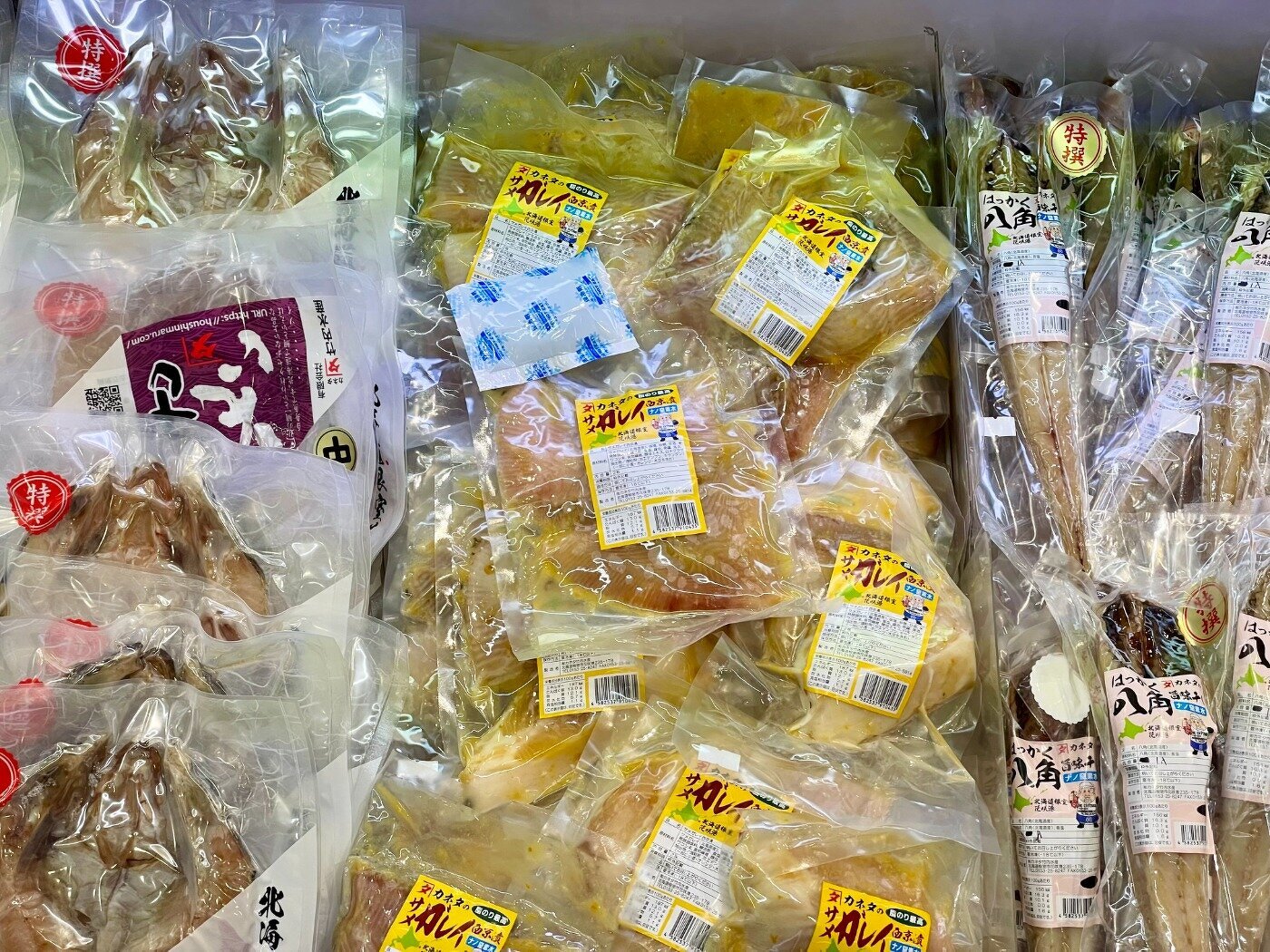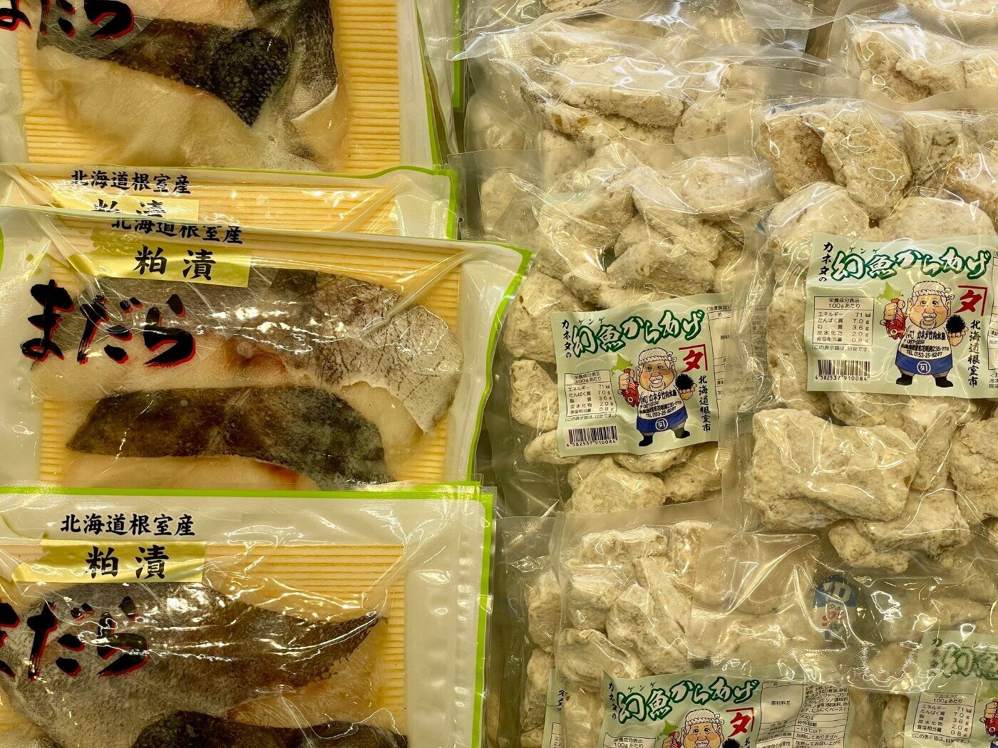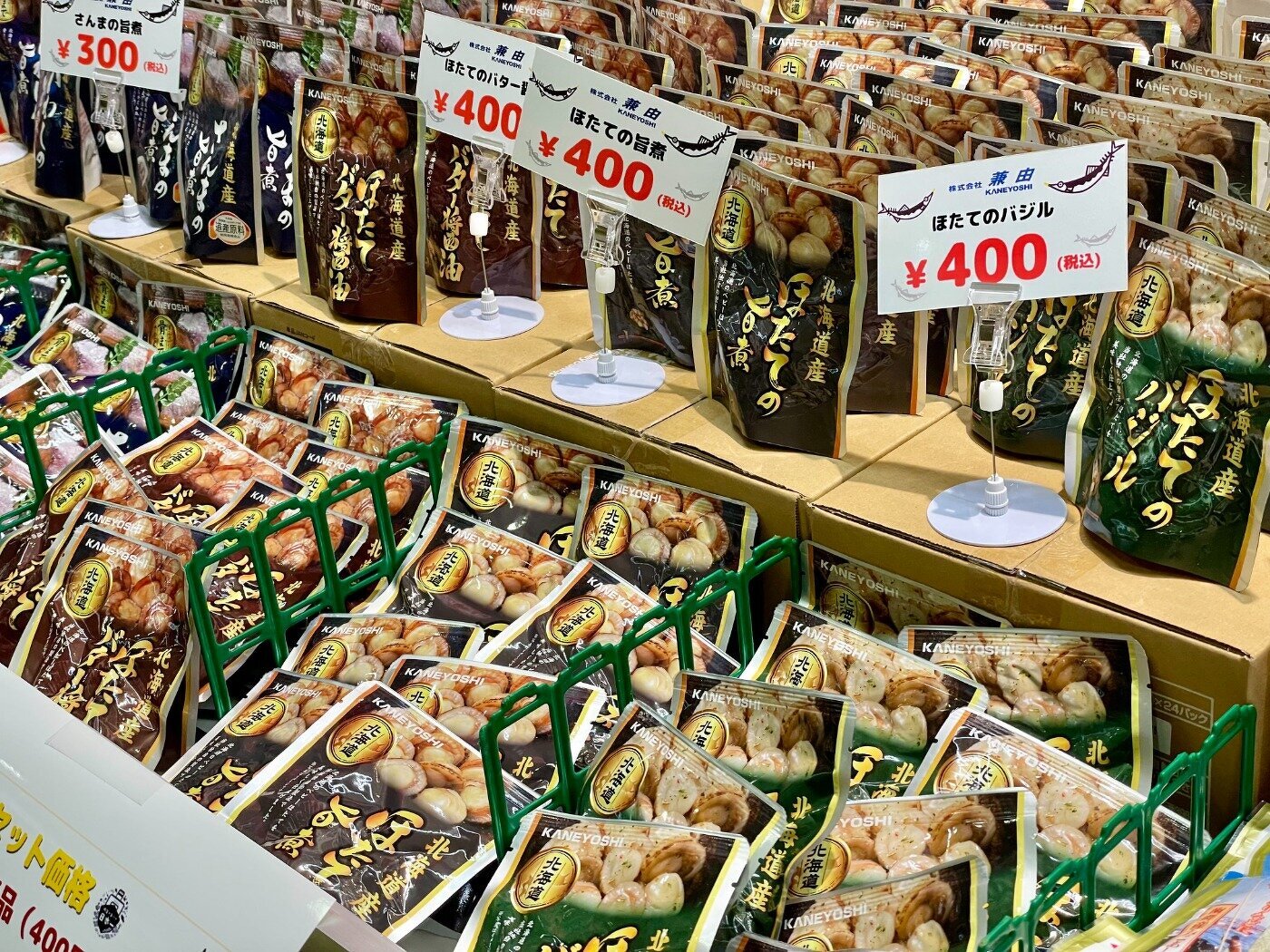 訳アリほっけ(キズ)、ホッカイエビ、花咲がに、〆サバ、いくら、生干しこまい、あさり、玉冷ほたて、汐サンマ、糠サンマ、ほや酢、タコ酢、煮つぶ、ふのり、イカの塩辛とジャンカラ、くじらユッケ、鮭フレーク、ほっきご飯、鮭切身、鮭半身、たらこ、冷凍ほっき、毛ガニ、大の貝、レトルトサンマ、犬のおやつこまい、レトルトカレー、トバカップ、そのままコマイ、カンカイ、切出し昆布、棹前早煮昆布、あつば根昆布、こんぶだし瓶、パリパリ昆布、八角 旨み干し、ソイ 旨み干し、つぶレトルト、タラフライ、イカフライ、ゲンゲ唐揚げ、サメカレイ 西京漬け、はぼまい昆布しょうゆ贅沢仕上げ、歯舞とろろ昆布、真鱈切身 粕漬、さんまの旨煮、いわしの旨煮、ほたての旨煮、ほたてのバター醤油、ほたてのバジル
