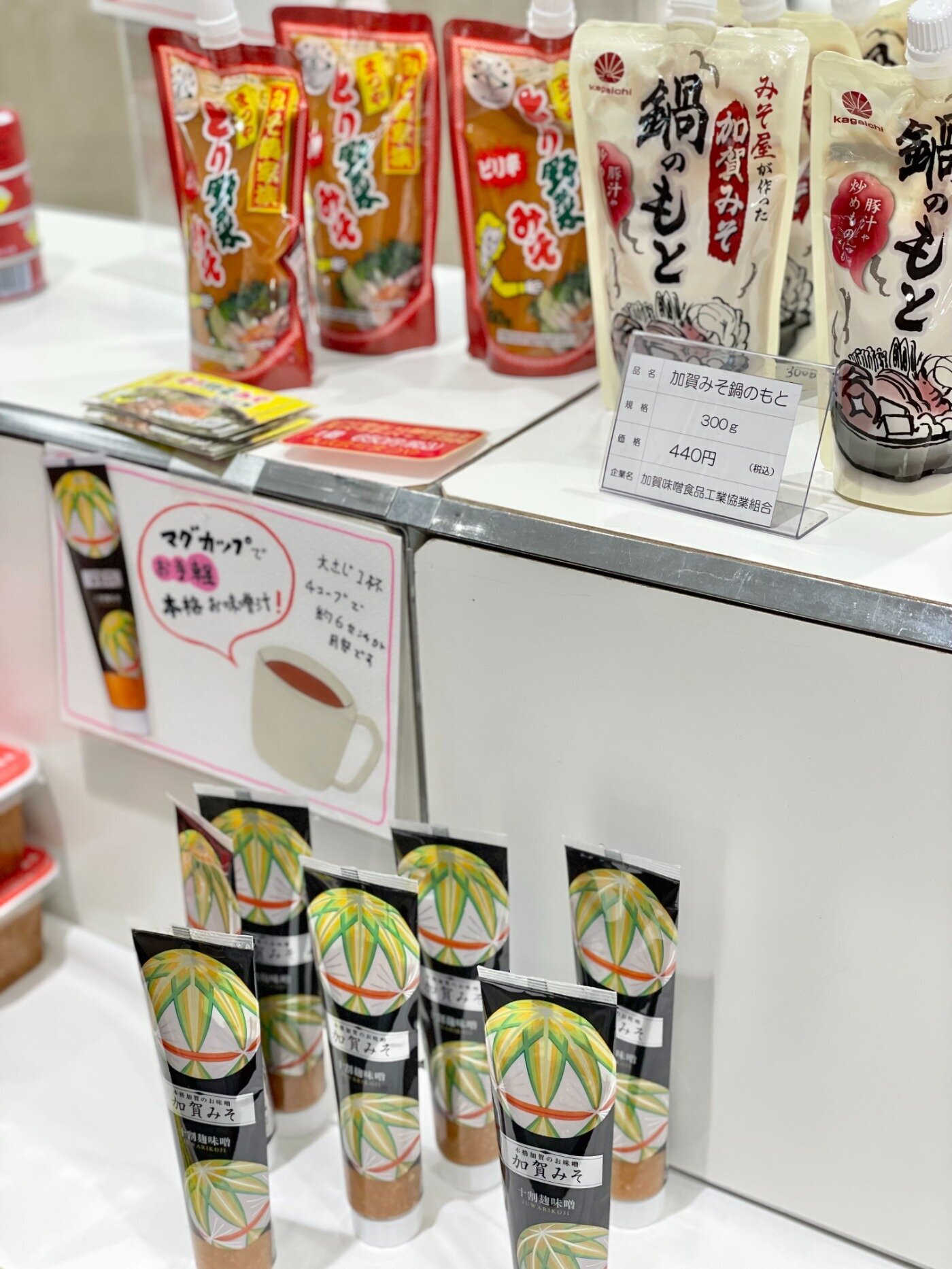 献上加賀棒茶、ビーバー(白エビ/カニ)、タラの子缶、いもだこ缶、あさりしぐれ煮缶、じぶ煮缶、とり野菜みそ(ごま/ごま坦々ほか)、能登揚げ浜ワイン塩、干ししいたけ、ホタルイカ、焼き塩ふぐ、チャンピオンカレー(甘口/中辛)、純米甘酒、奥能登揚げ浜塩、ひと汐さかな鯛、揚げ浜汐ラーメン、いかいしる、加賀みそチューブ十割こうじ味噌、加賀みそ鍋のもと、ひゃくまん穀味噌、ひゃくまん穀(米)、のどぐろ茶漬け、金澤はちみつ百花、金澤柚みつ、金沢はちみつ入り粉末甘酒、はちみつジャム能登(いちじく/ブルーベリー)、きんつば、きんつばうぐいす、諸江屋塩どら焼き、金の麗澤、能美ゆず、金沢醤油パイ、加賀ぽてと、切り餅、かきもち(きのこ揚甘/野菜ほっくり/野菜柚子)、のトニック(いちじく/ローリエ)、ひゃくまん穀お米クリームチーズバーム、加賀の棒茶バーム、加賀百万石あんころ餅、北陸紀行、金箔抹茶羽二重、加賀かきもち(素焼き/醤油)、白エビおかき焼塩味、昆布振りあられ焼塩味、加賀焼無選別MIX、加賀焼柴舟、能登塩炭酸カルシウム煎餅、開運おみくじ煎餅、加賀煎餅白雪(金沢ゆず)