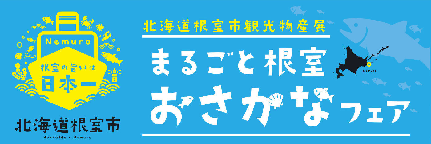 日本列島本土最東端に位置する根室市は、太平洋とオホーツク海に面し、豊かな漁場を持つまちです。そんな根室市から直送される「花咲がに」や「北海しまえび」をはじめとした水産加工品の販売を行う「まるごと根室おさかなフェア」を開催します!根室の魅力がまるごと詰まったフェアですので、皆様、是非この機会にご来場ください!