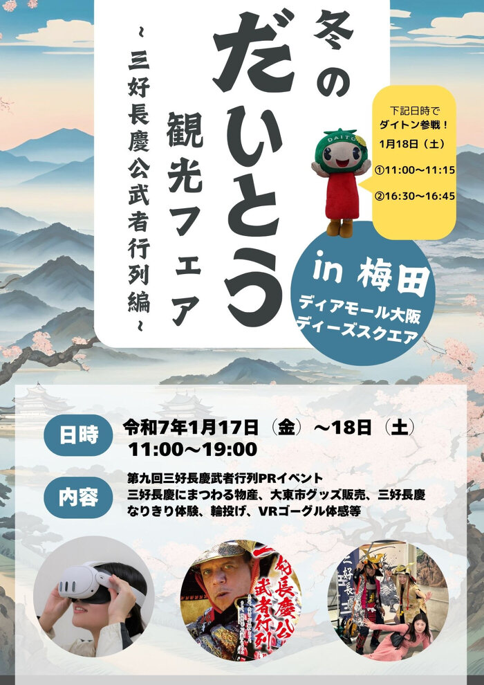大東市の観光と魅力を発信するイベントを、令和7年1月17日(金)~18日(土)にディアモール大阪内ディーズスクエアにて開催いたします!