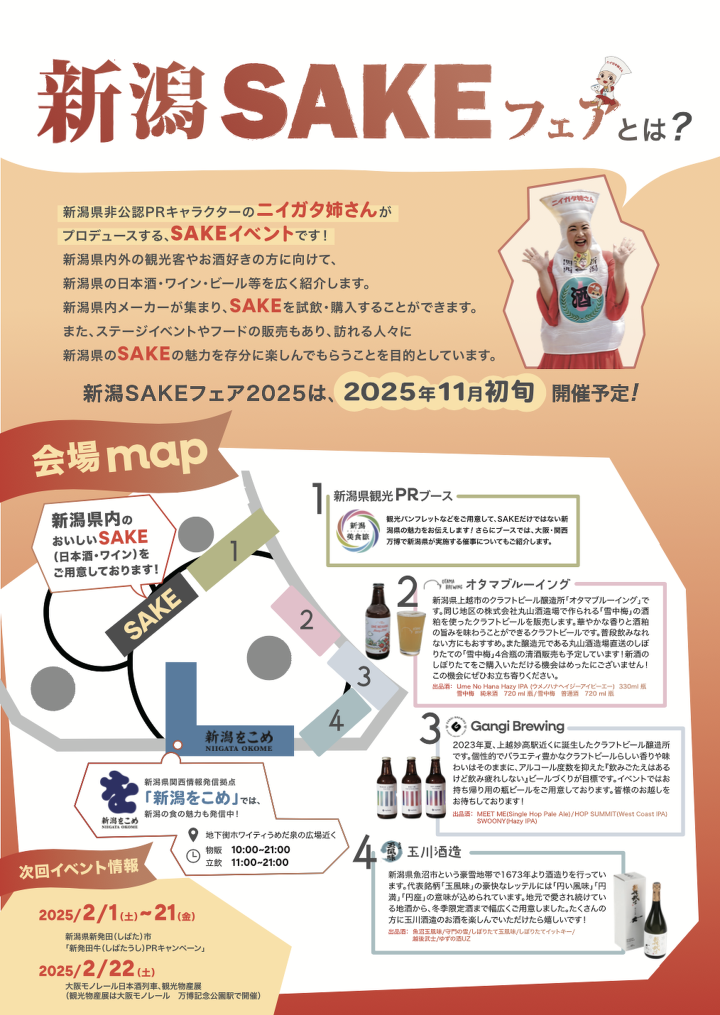 内 容|新潟県内のSAKE(日本酒・ビール・ワイン)新潟県産品のPR、物販、新潟県観光PR