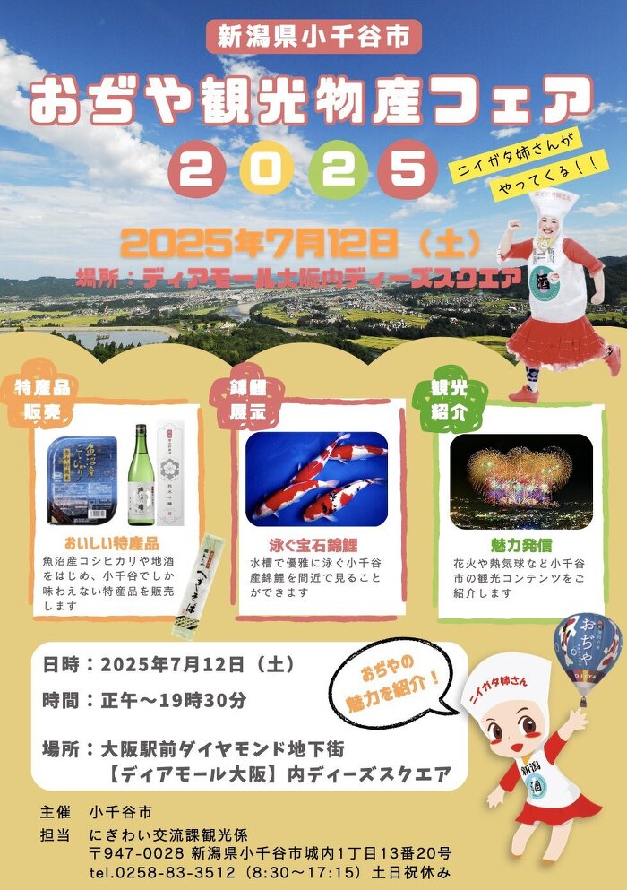 新潟県小千谷市の魅力を発信する「おぢや観光物産フェア2025」を、ディアモール大阪「ディーズスクエア」にて初開催いたします。小千谷市の魅力を存分にお楽しみいただける、盛りだくさんの内容をご用意しております。