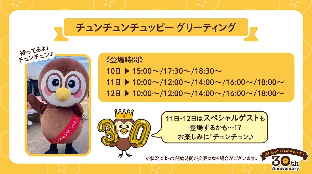 とってもキュートな扇雀飴本舗の公式キャラクター「チュンチュンチュッピー」が会場にやってきます!一緒に記念撮影をして、楽しい思い出を作りましょう!特別ゲストも来るかも!?